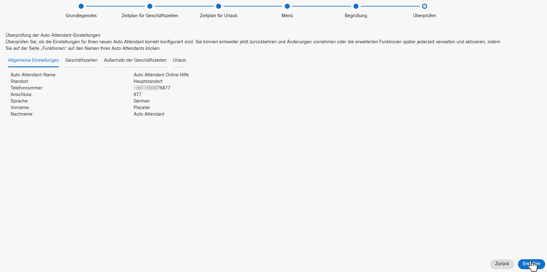 Über die Tabs Allgemeine Einstellungen, Geschäftszeiten, Außerhalb der Geschäftszeiten und Urlaub können Sie nochmal die eingestellten Optionen einsehen.