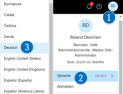 In dieser Anleitung nutzen wir deutsche Version des Control Hubs. Die Sprache im Control Hub ändern Sie, indem Sie oben rechts auf den runden Administrationsbutton klicken und bei Sprache/Language Deutsch auswählen.