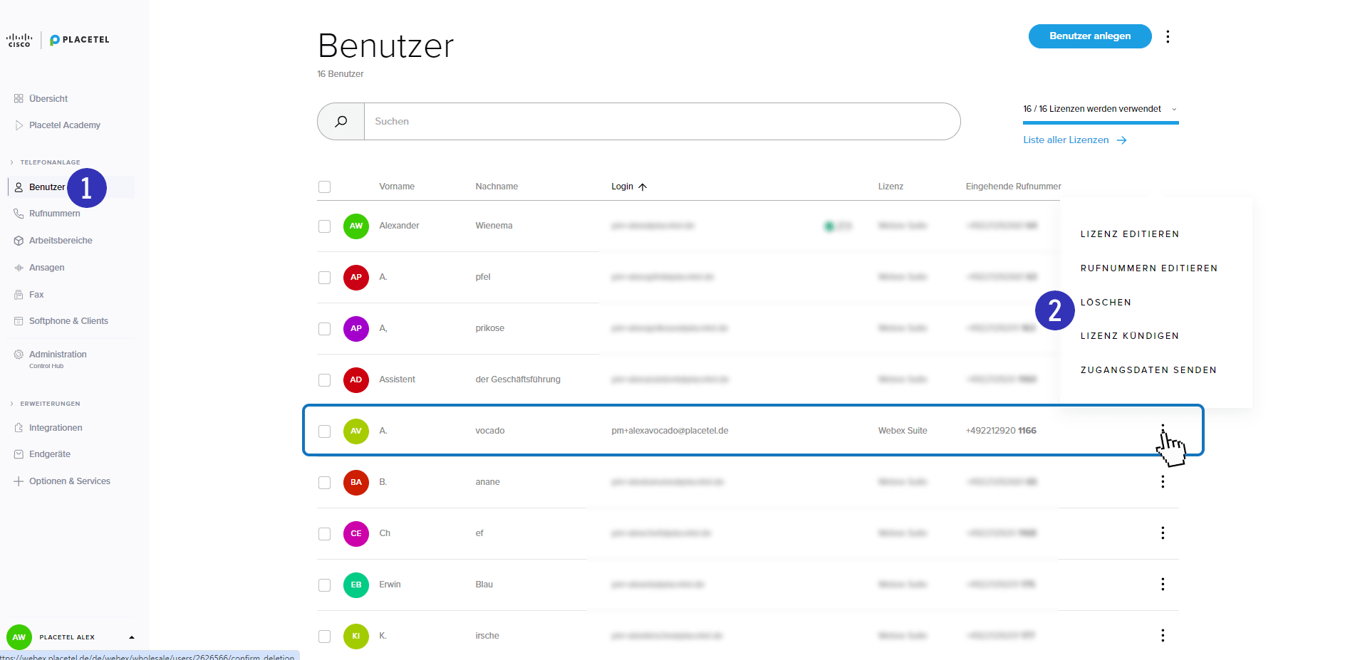 Sollte ein Benutzer Ihre Organisation verlassen, oder sollten andere Gründe vorliegen den Benutzer zu löschen, können Sie die über das Placetel Order Portal tun.
