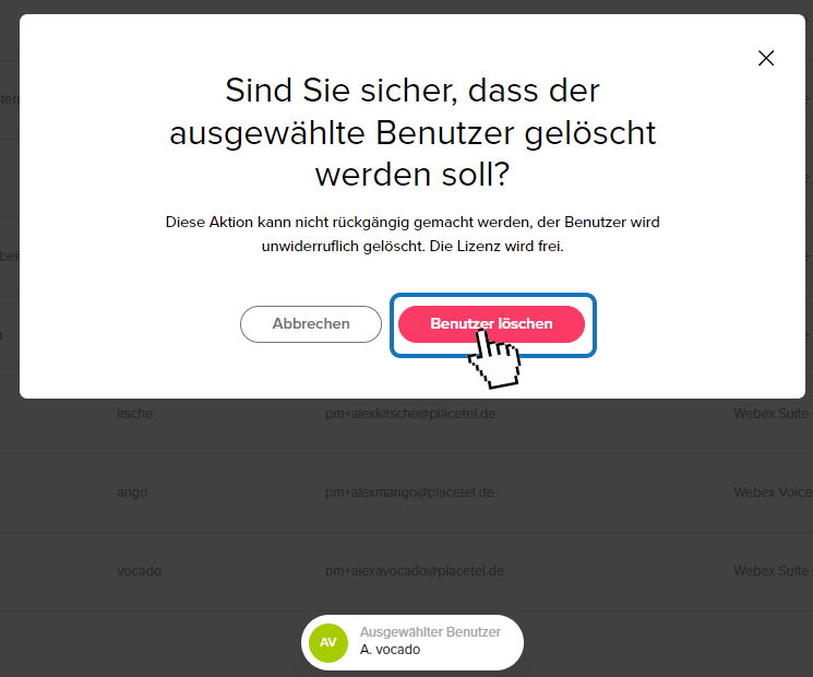Wenn Sie einen Benutzer löschen, greift diese Löschung sofort und der Benutzer kann sich nicht mehr über Webex einloggen.