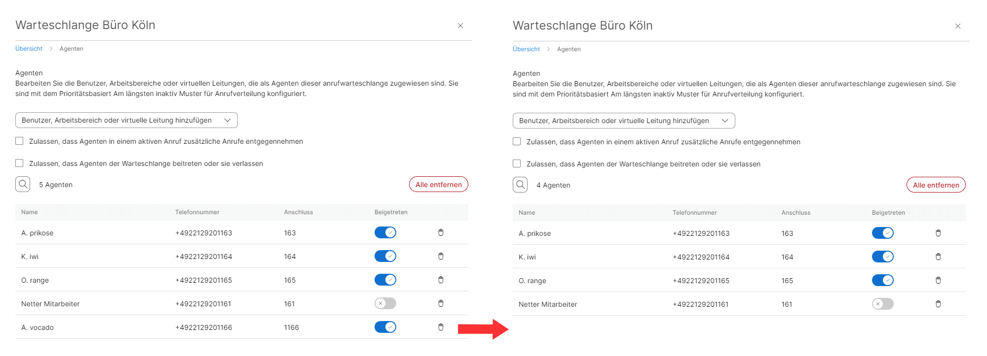 Die Rufnummer die dem Benutzer zugewiesen wurde, steht Ihnen selbstverständlich weiterhin zur Verfügung und kann jetzt für einen anderen Benutzer oder einer Funktion wie z.B. eine Warteschlange genutzt werden.