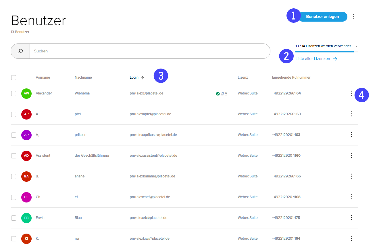 (3) - In dieser Tabelle können Sie nun Ihre angelegten Benutzer einsehen. Für jeden Benutzer sehen Sie hier den Vor- und Nachnamen, die E-Mail Adresse (die auch für den Webex Login verwendet wird), die Art der Lizenz und die zugewiesene eingehende Rufnummer. Zudem wird angezeigt, wenn für einen Benutzer die Zwei Faktor Authentifizierung eingerichtet wurde (s.u.).