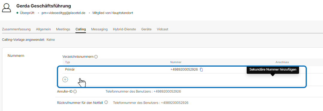 Die Primäre Rufnummer ist die Rufnummer, auf der Ihr Mitarbeiter eingehende Anrufe empfängt und ausgehende Anrufe tätigt.