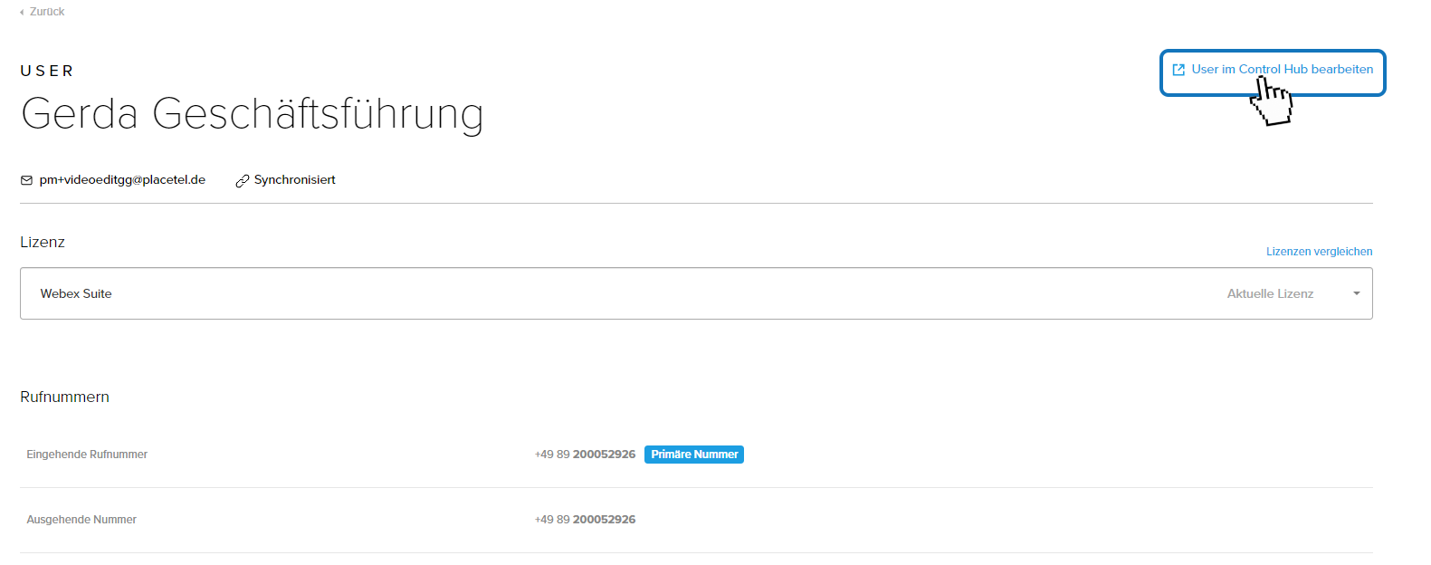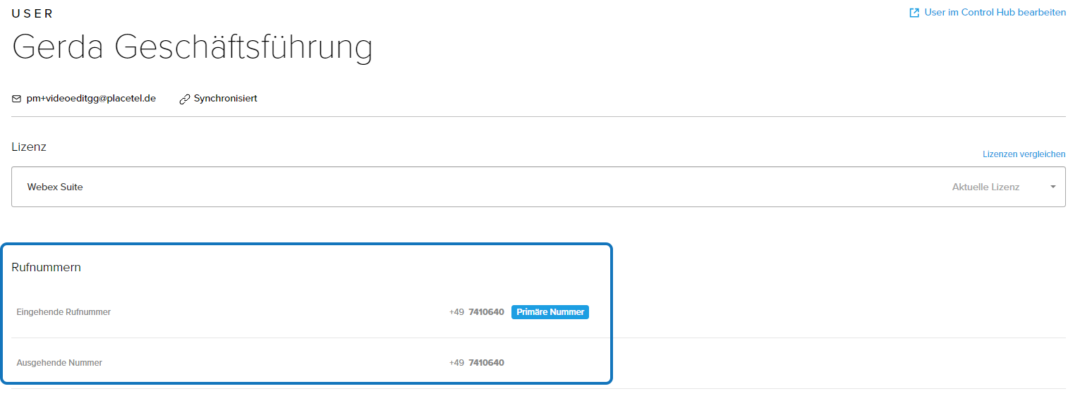 1.) Klicken Sie im Placetel Order Portal auf der Bearbeitungsseite Ihres Mitarbeiters auf User im ControlHub bearbeiten.