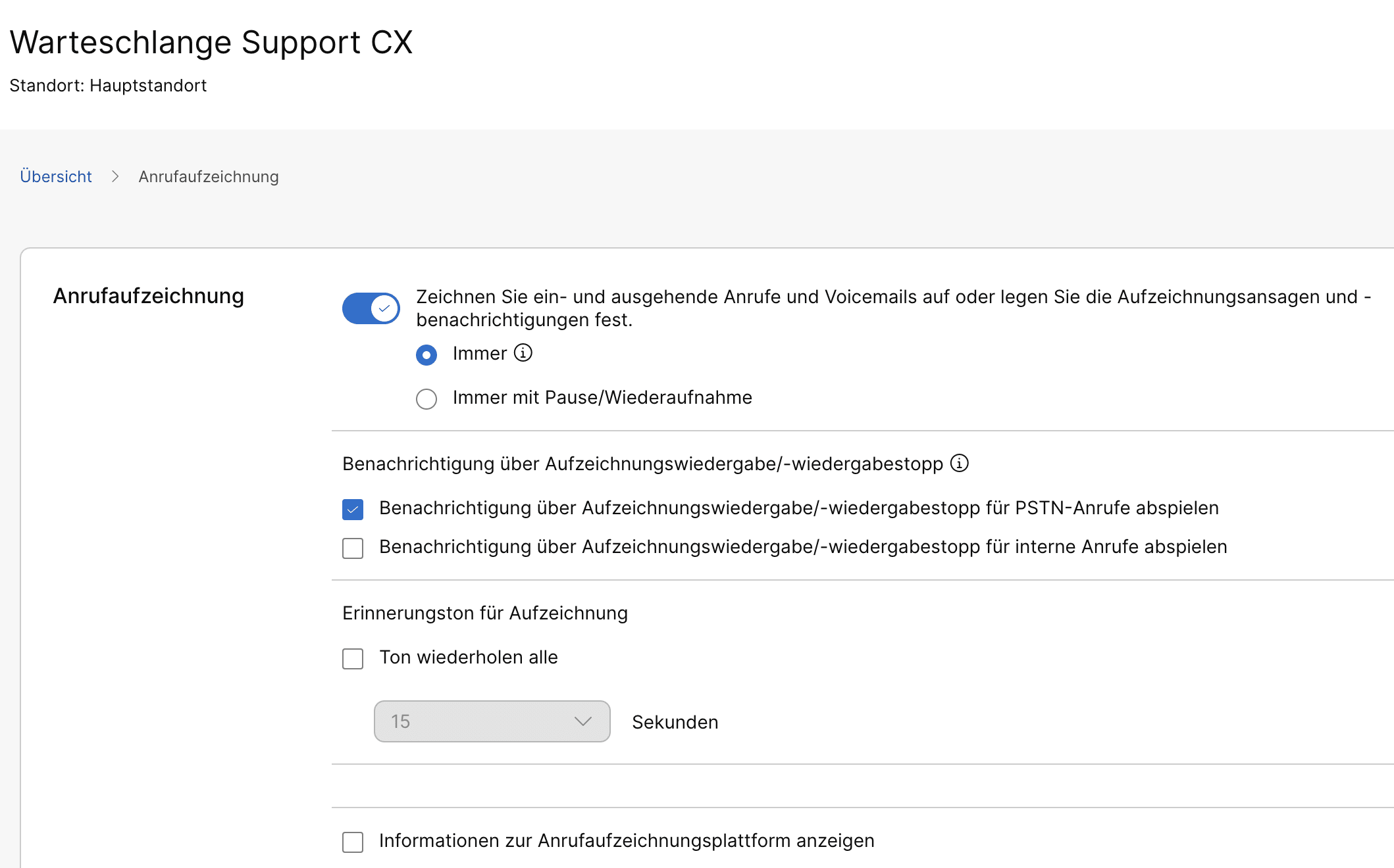 Für die Customer Essentials Warteschlangen ist es möglich die Option der Gesprächsaufnahme zu aktivieren.