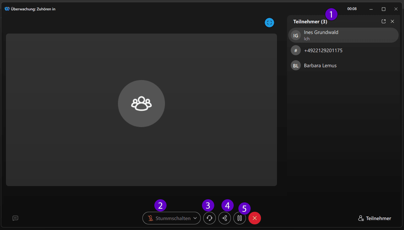 - 4 Barge in - Mit der Funktion greift der Supervisor in das aktive Telefonat ein. Es entsteht quasi eine 3er-Konferenz.