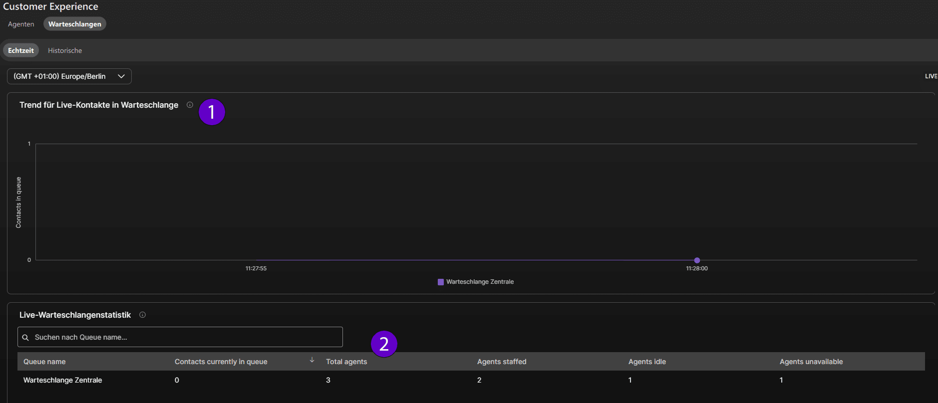 - 2 Agentenübersicht - Gibt Ihnen die Livedaten zu Ihren Agenten. Zeigt u.a. an, wie viele Agenten sich gerade in welcher Warteschlange befinden und wie viele davon aktiv oder nicht erreichbar sind.