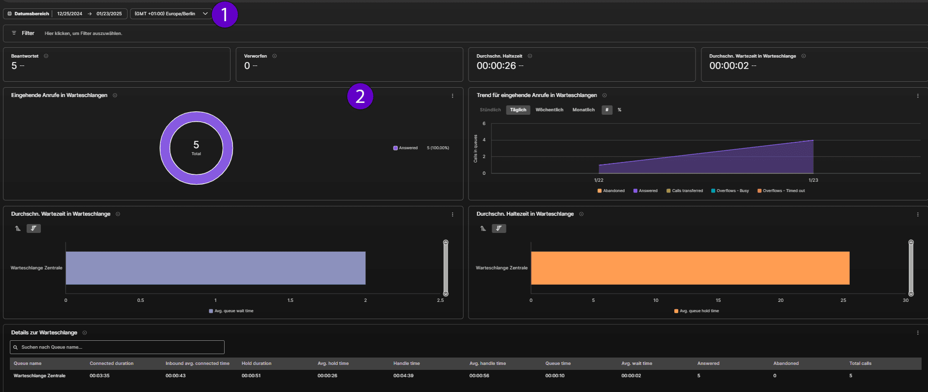- 1 Live-Graph - Dieser Graph zeigt Ihnen im Live-Bild das Anrufvolumen der Warteschlange(n) an.