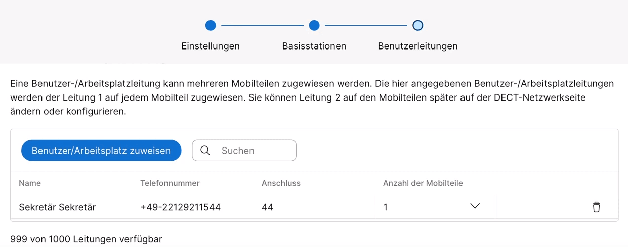 Legen Sie nun fest, welche Nutzer Leitungen in dem DECT-Netzwerk zugewiesen bekommen soll. Auch die Anzahl der Mobilteile wird hier festgelegt.