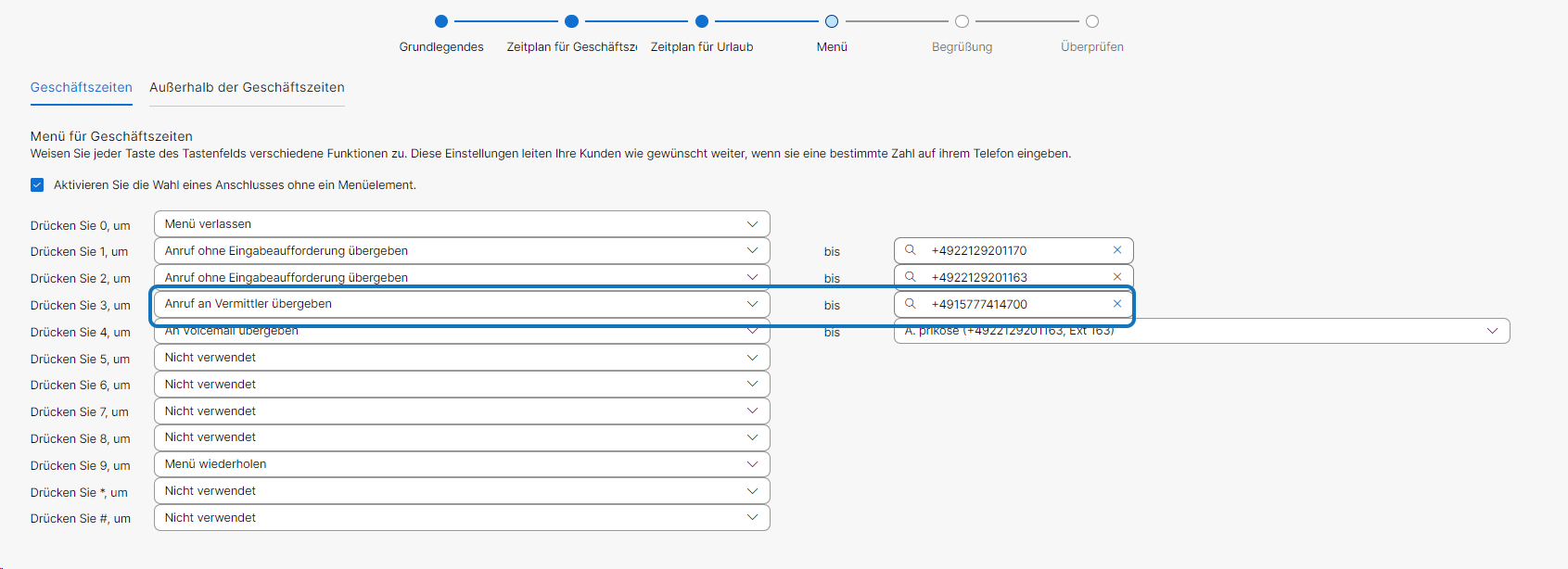Gemäß dem Beispielszenario, können Sie im rechten Screenshot einsehen, wie Sie eine Mobilfunknummer im Sprachmenü einbringen können. (Bedenken Sie, dass Sie auch das IVR für außerhalb der Geschäftszeiten konfigurieren müssen). - Erledigen Sie die weiteren Schritte, um den Auto Attendant anzulegen.