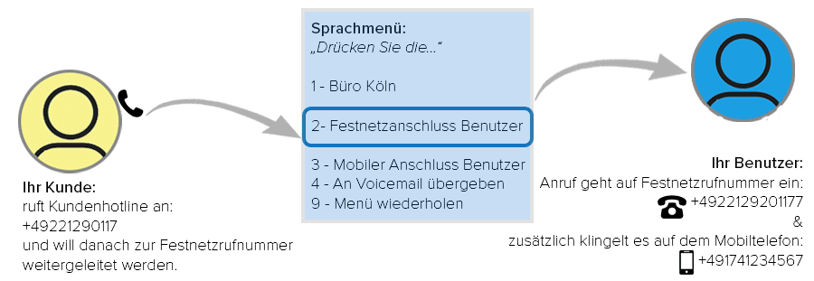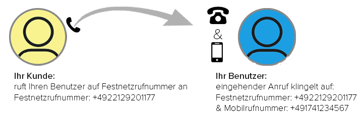 Ein eingehender Anruf auf die Festnetzrufnummer: +4922129201177 klingelt gleichzeitig auf der mobilen Rufnummer +491741234567.