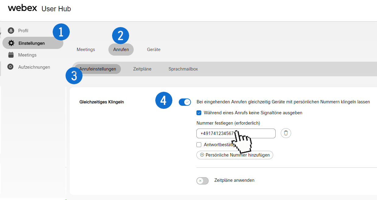 Control Hub: Gleichzeitiges Klingeln - Aktivieren Sie die Einstellung Bei eingehenden Anrufen gleichzeitig bei persönlichen Nummern klingeln und tragen sie unter Nummer festlegen die gewünschte Mobilfunknummer ein, auf der es gleichzeitig mit ihrem Webex User klingeln soll (z.b. +491741234567)