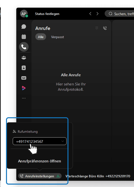 Wir empfehlen hier zuerst wie in Szenario 3 beschrieben, einen Auto Attendant anzulegen, der auch im Sprachmenü die Festnetzrufnummer des Benutzers inkludiert.