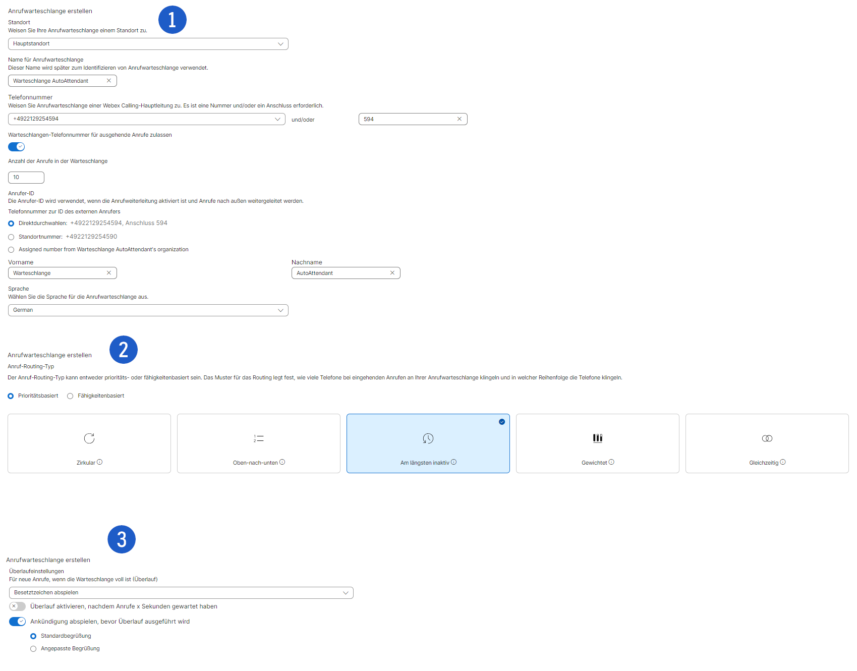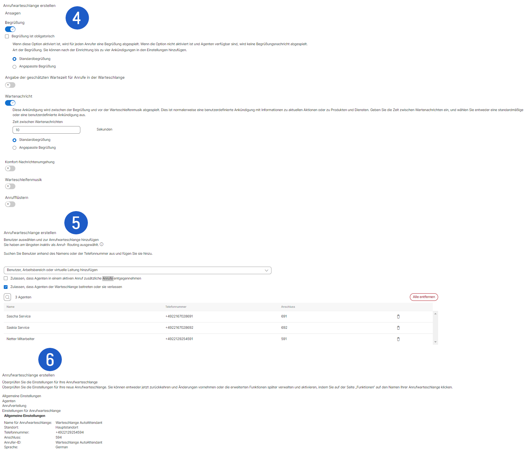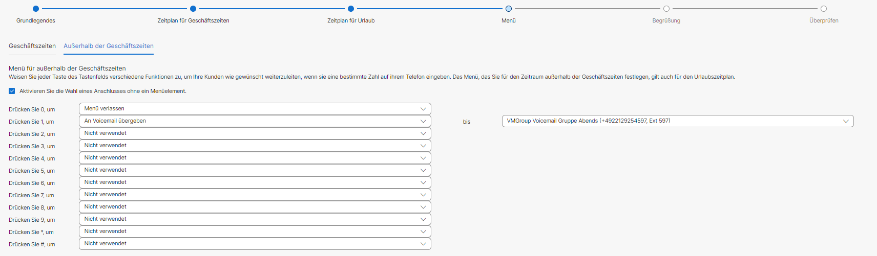 Damit ist die Konfiguration eingerichtet. Sie können unter Begrüßung noch eine Begrüßung festlegen, die der Anrufer hört. Unter Überprüfen können Sie Ihre Einstellungen nochmal bearbeiten. Klicken Sie abschließend auf Erstellen.