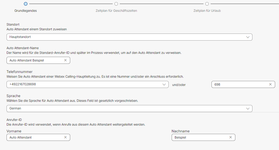 Unter Grundlegendes werden erstmal grundlegende Informationen für den Auto Attendant wie die Telefonnummer oder die Sprache abgefragt.
