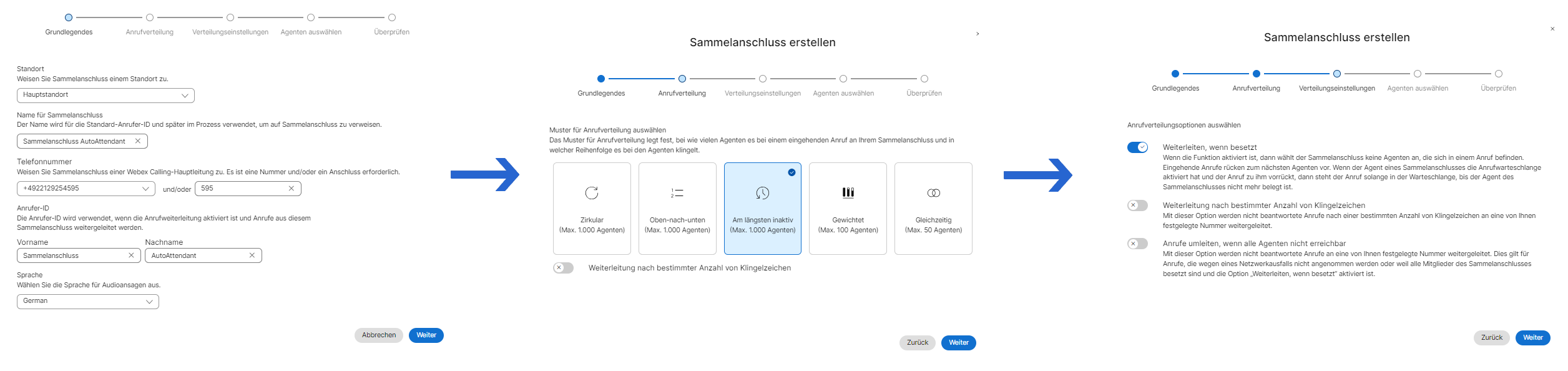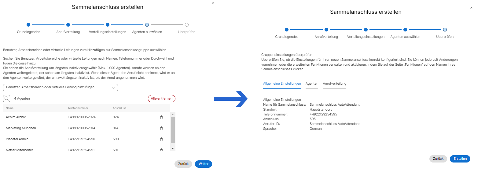 Legen Sie den Sammelanschluss an, indem Sie die einzelnen Konfigurationsseiten durchlaufen und die abgefragten Informationen befüllen. In unserem Szenario sind die Anforderungen an dem Sammelanschluss nicht weiter spezifiziert. Orientieren Sie sich gerne, an unserem Beispiel.