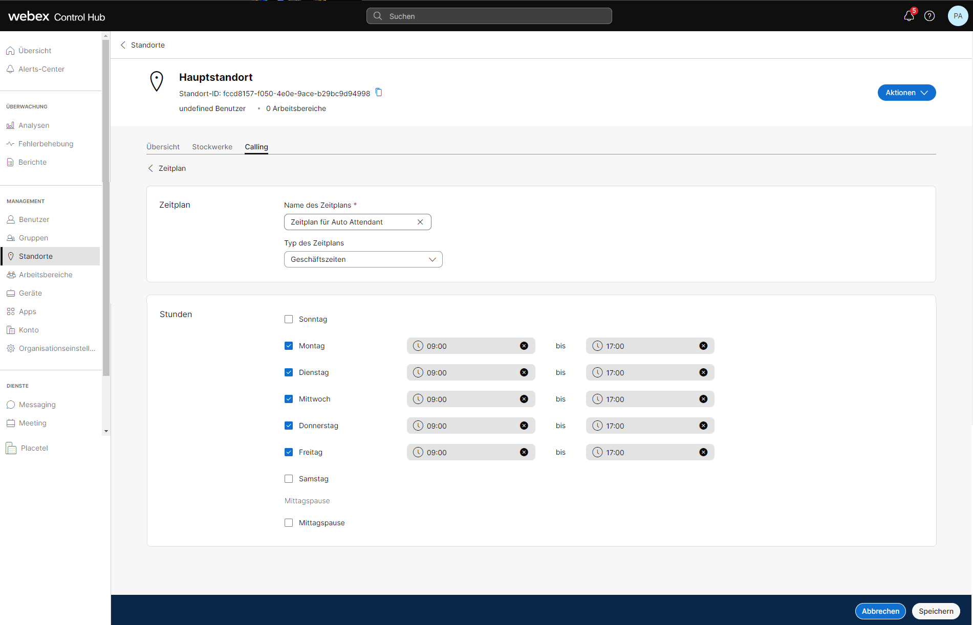 Management → Standorte → Standort auswählen → Calling → Einstellungen für Calling Funktionen → Zeitpläne → Zeitpläne hinzufügen angelegt werden.