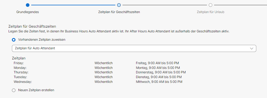 Die Geschäfts- und Urlaubszeiten werden bei Webex für Placetel über Zeitpläne definiert.