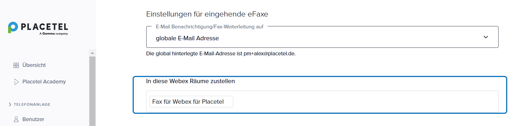 3.) Unter In diese Webex Räume zustellen können Sie nun den Webex Space auswählen, in dem der Placetel Webex Bot enthalten ist.