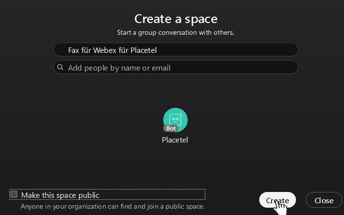 1.) Legen Sie in Webex einen neuen Space/Bereich an, der unseren Placetel Webex Bot beinhaltet. Fügen Sie zudem weitere Benutzer hinzu, die Faxe empfangen sollen.