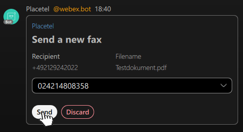 Sobald Sie ein Fax über unseren Placetel Webex Bot gesendet haben, erhalten Sie in Webex auch eine entsprechende Nachricht über den Versand des Faxes, sowie eine Mitteilung, ob das Fax erfolgreich versendet wurde.