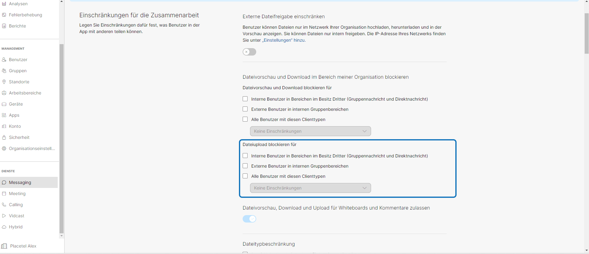 Im Control Hub: Dienste Messaging → Einschränkungen für die Zusammenarbeit → Dateiupload blockieren für