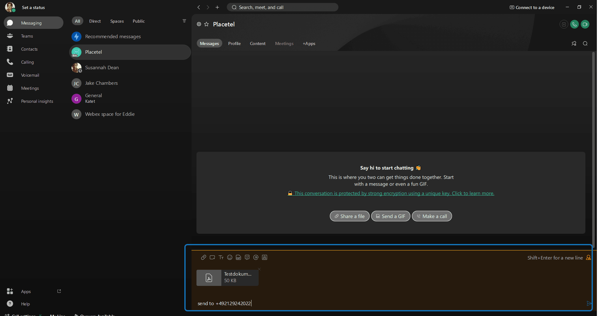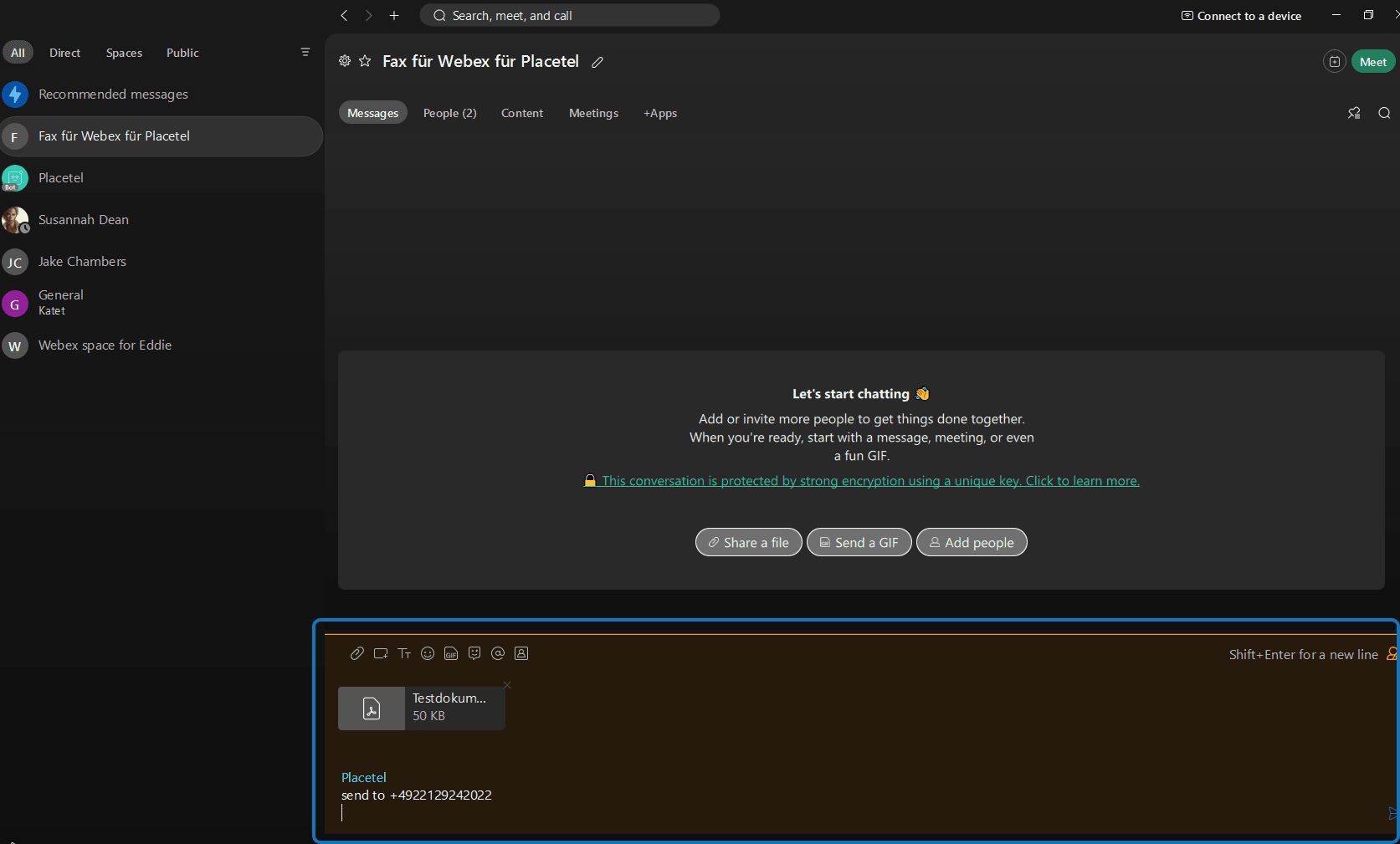Faxe können direkt in Webex über unseren Placetel Bot versendet werden. Dieser steht automatisch zur Verfügung.