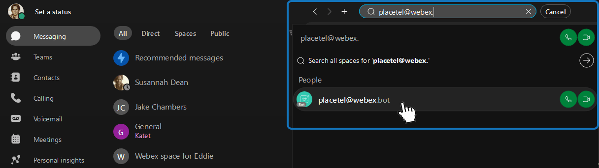 1.) Klicken Sie auf die globale Webex Suchleiste im oberen Bildschirmbereich und geben Sie in die Suchleiste „placetel@webex.bot ein. Wählen Sie dann den Bot unter People aus.