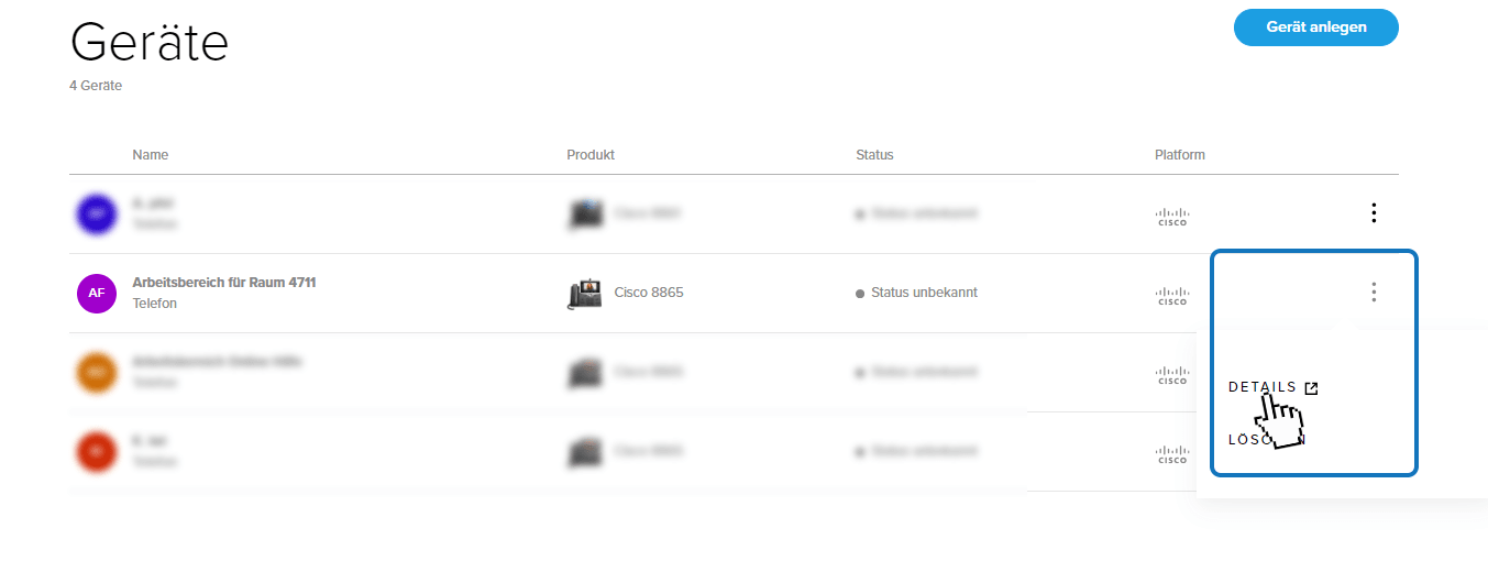 Die Geräte, die Sie über das Placetel Order Portal anlegen können orientiert sich an den von Cisco unterstützten Geräten. Eine aktuelle Auflistung dieser Geräte finden Sie hier.