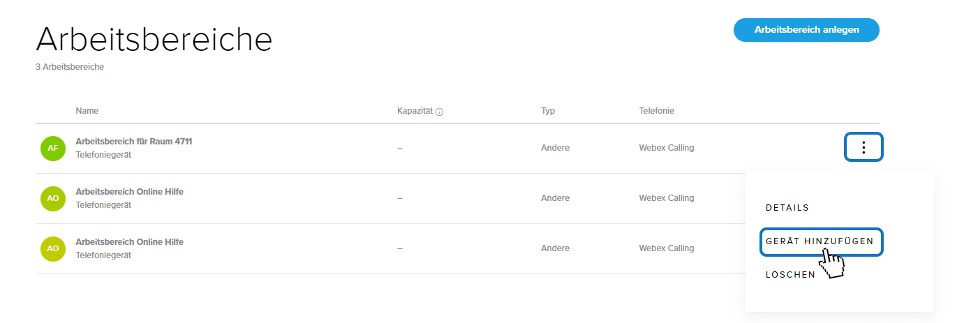 Eine alternative Variante um für einen Arbeitsbereich ein Gerät anzulegen, wäre wenn Sie bei einem Arbeitsbereich über die 3 Punkte den Menüpunkt Gerät hinzufügen auswählen.