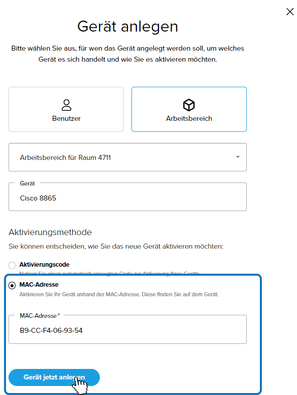 Eingabe MAC-Adresse Klicken Sie dann auf Gerät jetzt anlegen.
