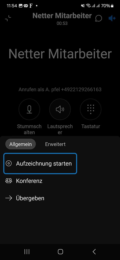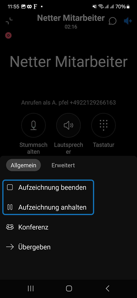 Sie erhalten dann während des Telefonats den Hinweis, dass der Anruf aufgezeichnet wird.