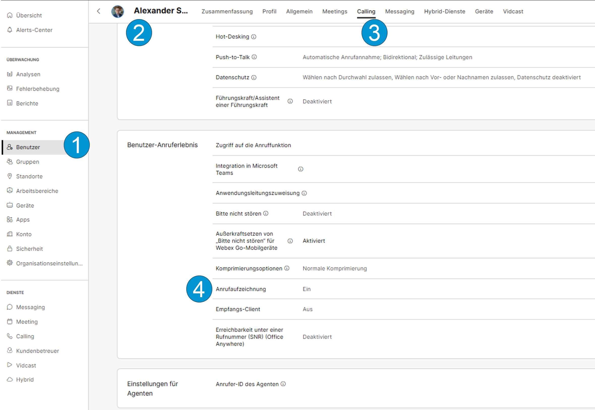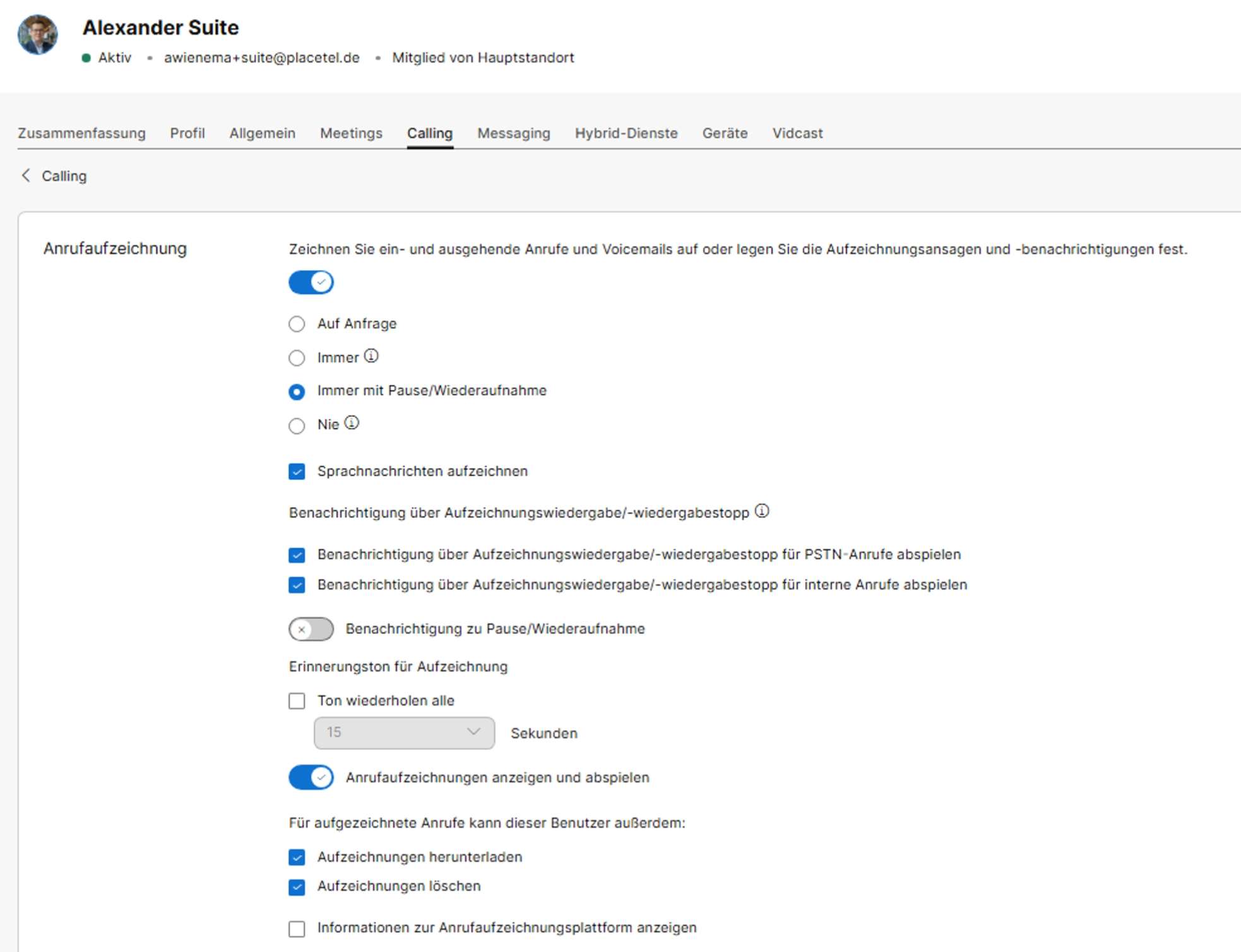 Management: Benutzer → Klick auf entsprechenden Benutzer → Reiter: Calling → Anrufaufzeichnung (im Bereich „Benutzer-Anruferlebnis“).