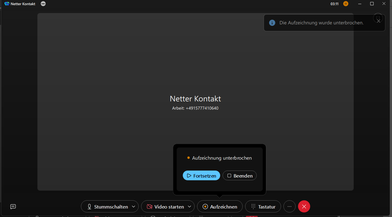 Sobald die Aufzeichnung läuft, erhalten Sie eine Meldung und können gleichzeitig die Aufzeichnung pausieren (und wieder fortsetzen), sowie die Aufzeichnung beenden.