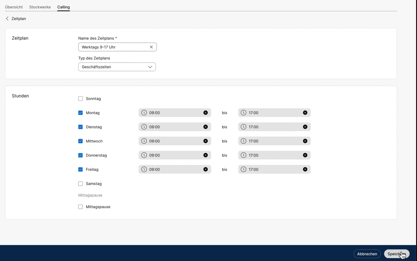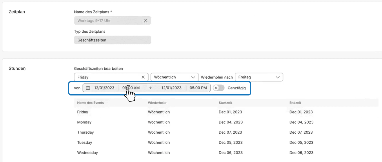 In diesem Beispiel zeigen wir Ihnen, wie Sie einen allgemeinen Zeitplan für Geschäftszeiten von 9:00 - 17:00 Uhr einstelen können