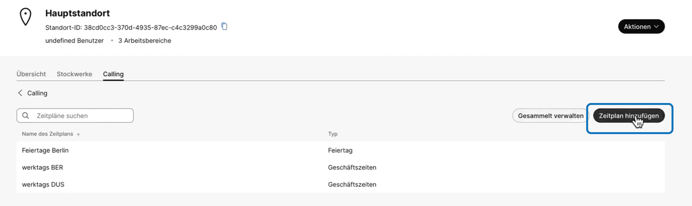 Standorte im Bereich Management → Hauptstandort → Calling → Zeitpläne.