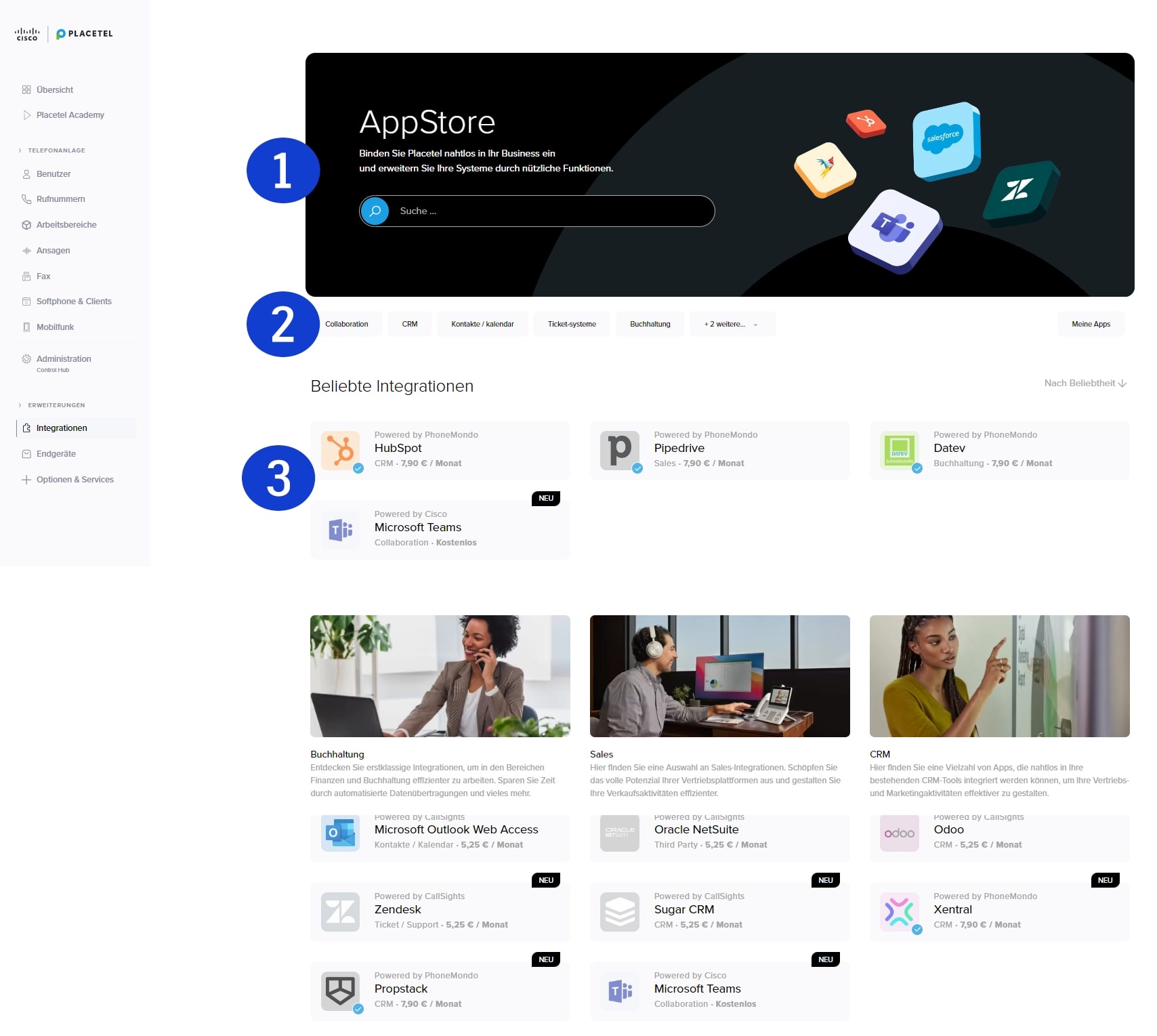 - 3 - Hier werden Ihnen all unsere Integrationen angezeigt, die wir derzeit über Webex für Placetel anbieten.