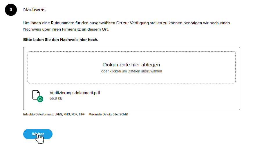 (3) Laden Sie im nächsten Schritt ein Dokument hoch, um Ihren Vorwahlbereich zu verifizieren.