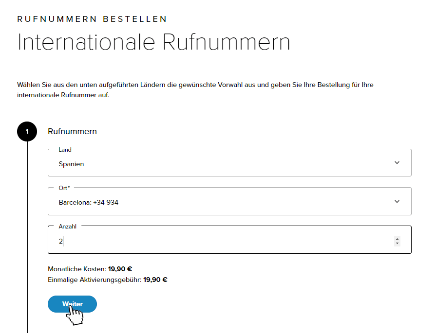 Internationale Rufnummern können aktuell für 12 Länder erworben werden:
