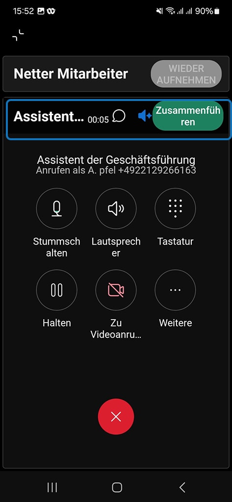 Sobald diese Person den Anruf entgegengenommen hat, können Sie die Konferenz über den Zusammenführen-Button einleiten.