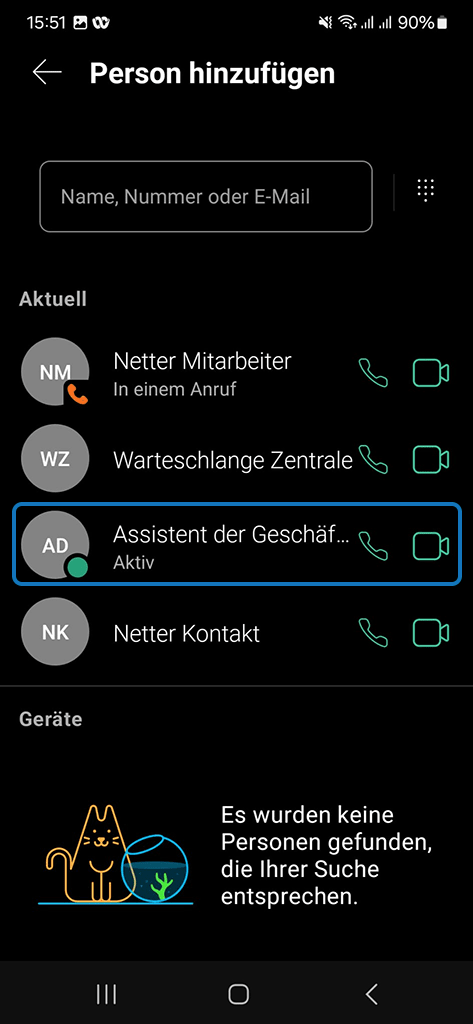 Sie können dann eine Person dem bestehenden Anruf hinzufügen, indem Sie in der Suchleiste, nach dem Benutzer suchen. Geben Sie dafür den Namen ein und klicken Sie dann auf das Hörer- oder Kamera-Symbol um die Person per Sprach- oder Videoanruf anzurufen.