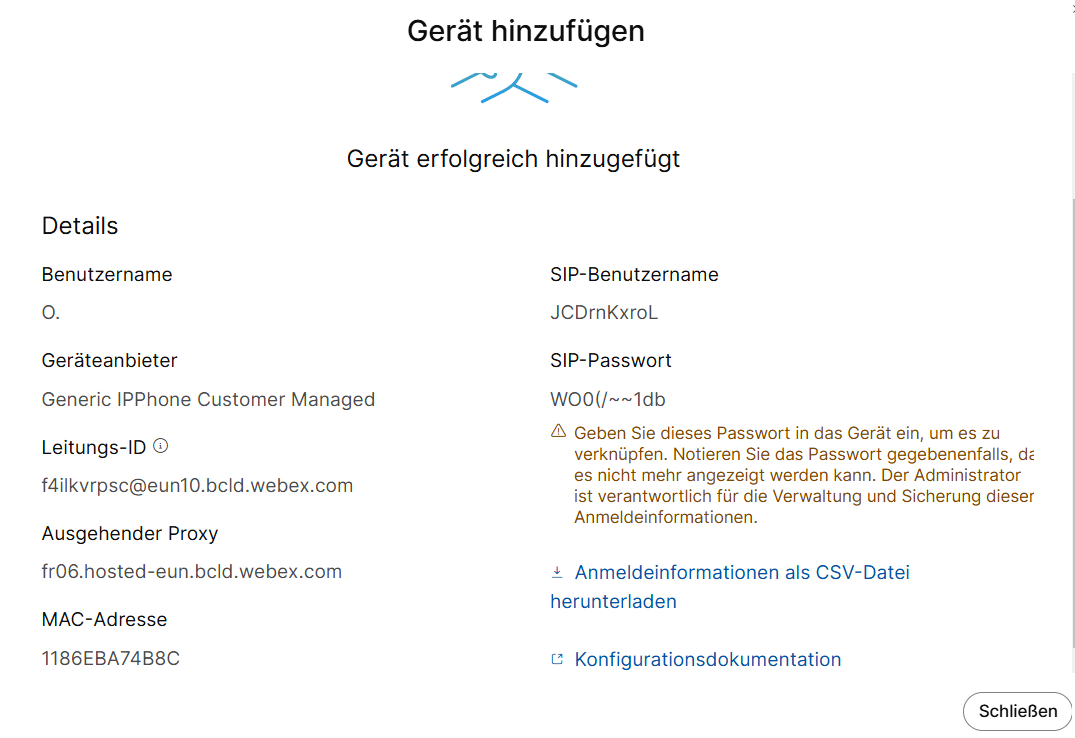 Hinweis: Das SIP-Passwort ist nur direkt nach dem Anlegen sichtbar.
