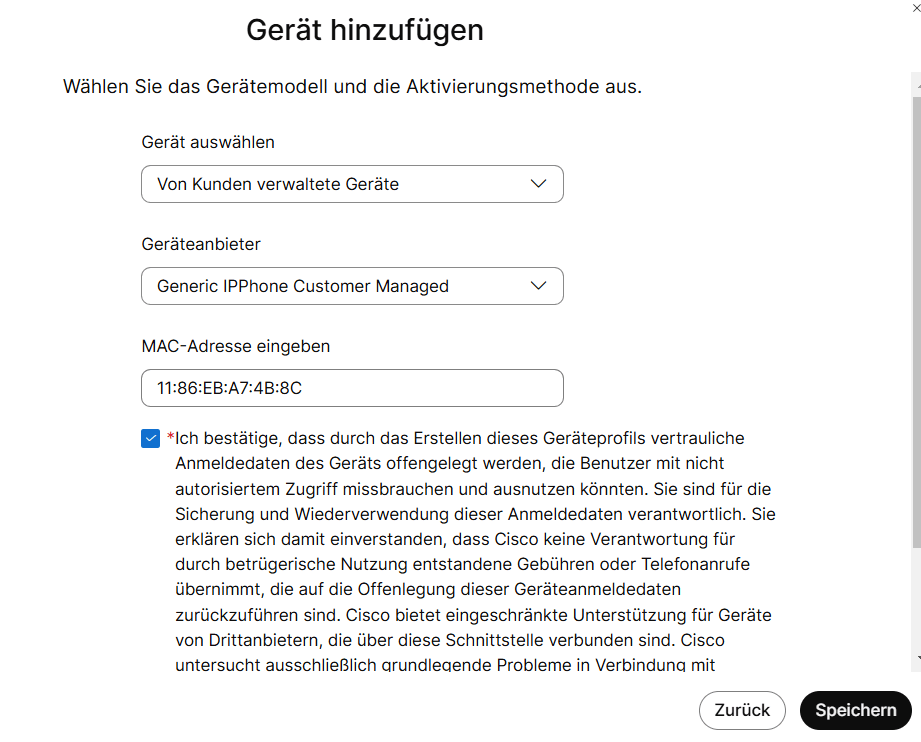 Sollte der benötigte Hersteller nicht in der Liste auftauchen wählen Sie entweder Generic Gateway Customer Managed oder Generic IPPhone Customer Managed aus.