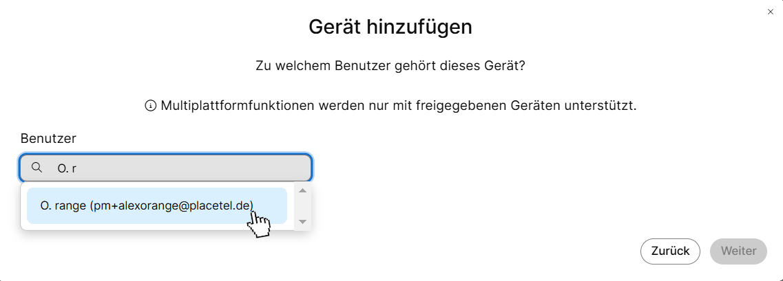 3.) Geben Sie dann per Eingabe in das dafür vorgesehene Feld den Namen des Benutzers ein, welcher dem Gerät zugewiesen sein soll.