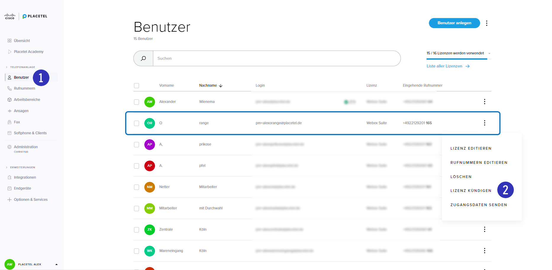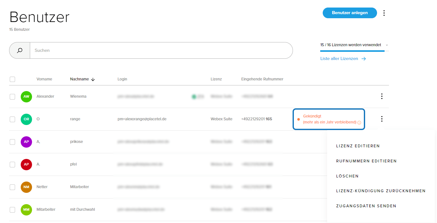 - Für eine Kündigung der Lizenz klicken Sie auf die 3 Punkte in der Zeile des entsprechenden Benutzers und wählen Sie dort Lizenz kündigen.