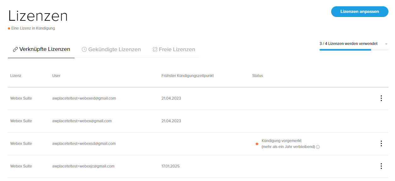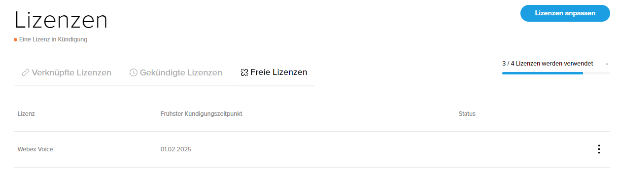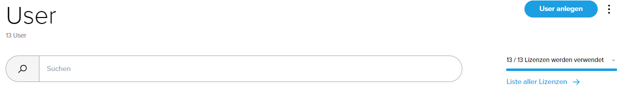 In der Lizenzübersicht können Sie Ihre mit Usern verknüpften, die gekündigten und die freien Lizenzen in Ihrem Portal einsehen.