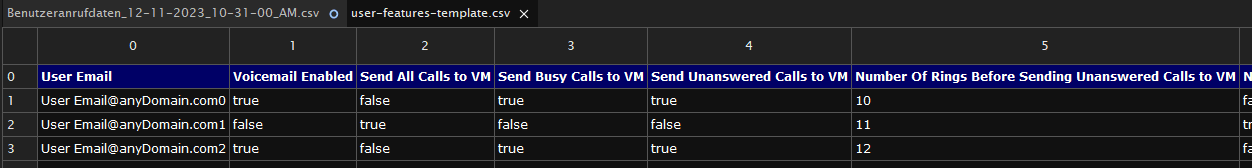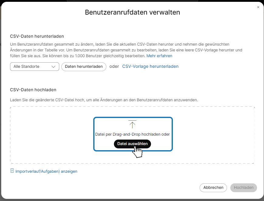 Bei größeren Organisationen kann es umständlich sein, für jeden einzelnen Mitarbeiter die Telefonie-Einstellungen vorzunehmen. Daher bietet Webex für Placetel die Möglichkeit per CSV-Dateien eine sogenannte Massenverwaltung von Anrufdaten vorzunehmen.