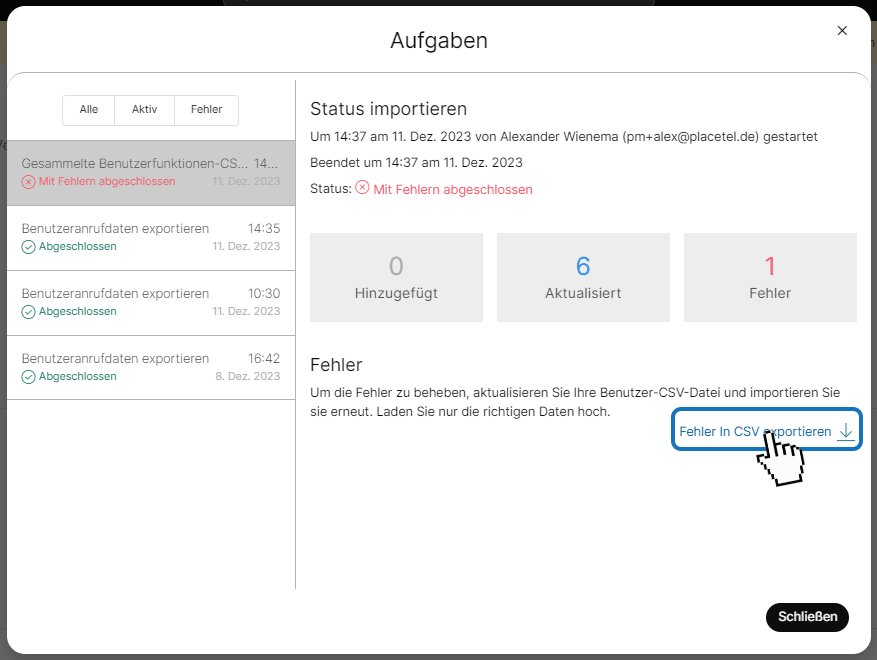 Um einsehen zu können, wo der Fehler entstanden ist, können Sie über den Button Fehler in CSV exportieren eine CSV Datei herunterladen, die den Fehler erklärt.