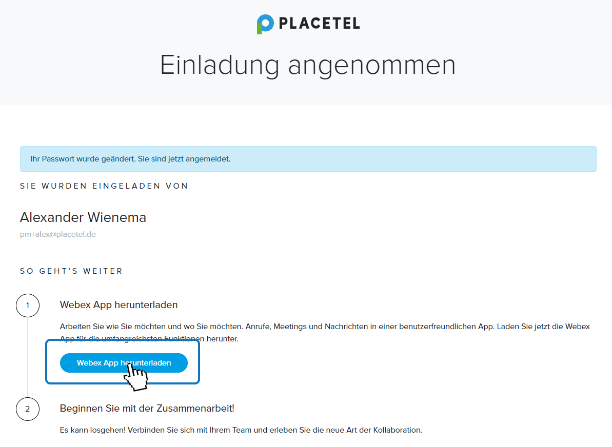 Dieser Benutzer erhält dann ebenfalls eine Einladung und kann, wie im vorherigen Kapitel beschrieben, sich sein Passwort vergeben und Webex nutzen.