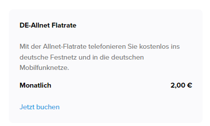 DE-Allnet Flatrate - Statten Sie Ihre Benutzer mit einer DE-Allnet Flatrate aus. Mit dieser lässt sich noch entspannter in alle Festnetz und Mobilfunknetz Deutschlands telefonieren. Diese Option steht Ihnen nur zur Verfügung, wenn Sie bei der Konvertierung aus der Testphase heraus sich nicht für die Flatrate entschieden haben.
